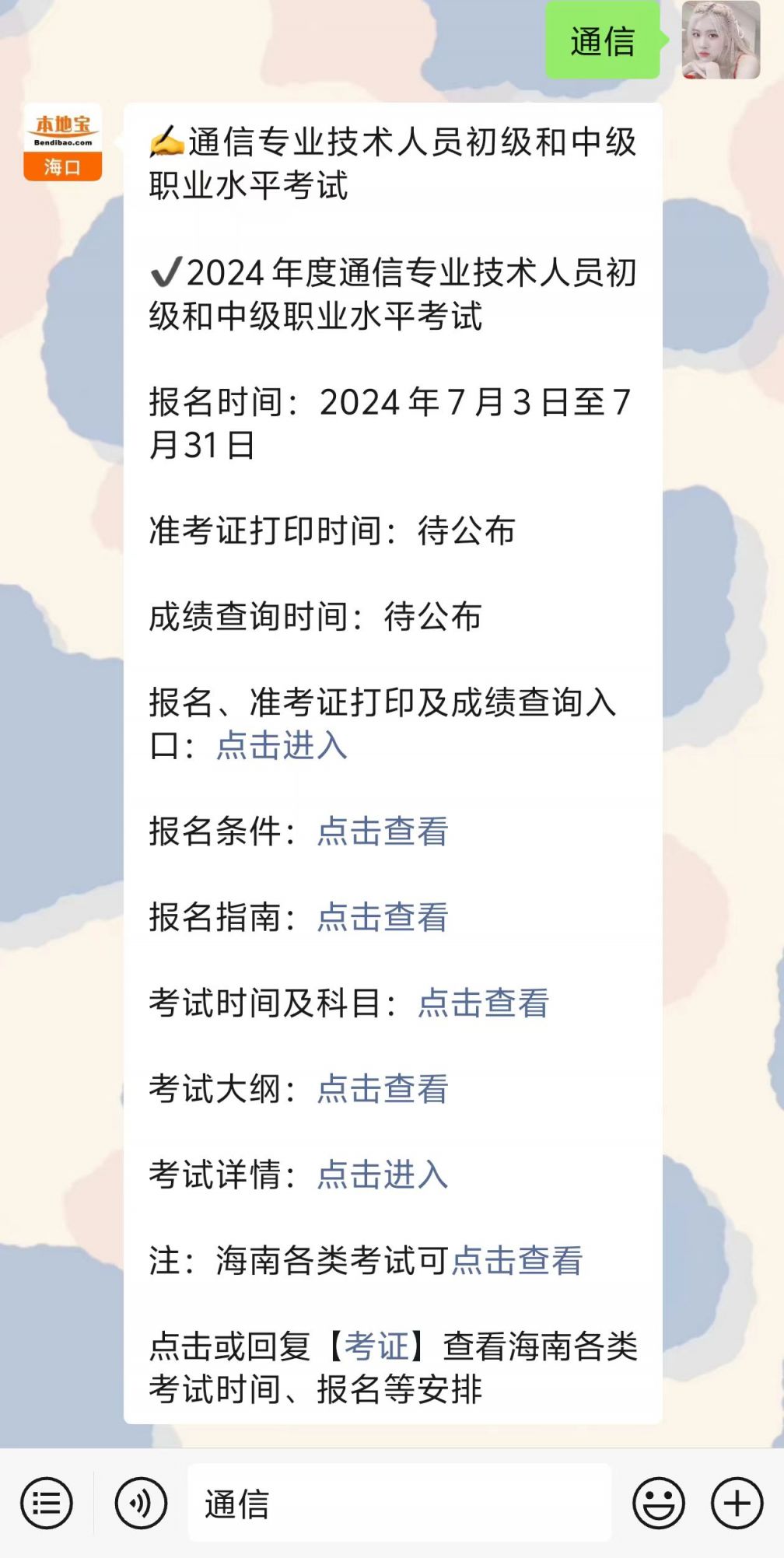 温馨提示:微信搜索公众号【海口本地宝】,关注后在对话框回复【通信】可获海南通信专业技术人员初级和中级职业水平考试报名入口/条件/指南,查看考试时间/科目等。