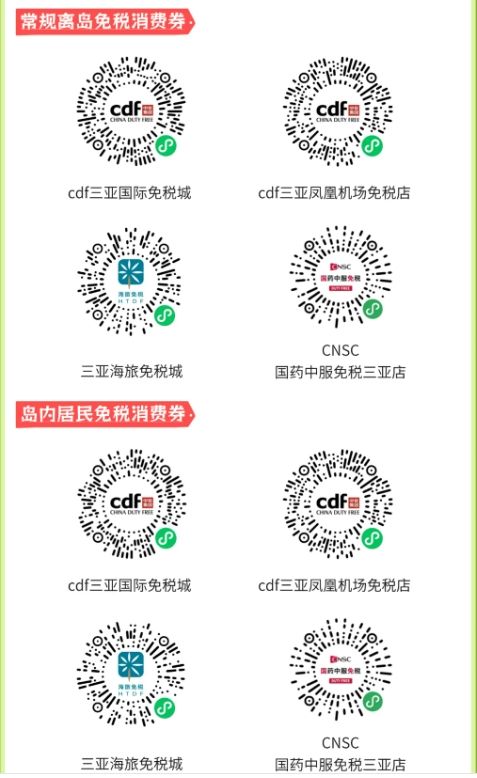 ①常规离岛免税消费券 满50000元减4000元、满30000元减2400元、满20000元减1500元 满15000元减1000元、满10000元减640元、满6000元减300元 ②岛内居民免税消费券 cdf三亚国际免税城:满5000元减500元、满3000元300元、满1000元减100元 cdf三亚凤凰机场免税店:5000元减500元、满3000元300元、满1000元减100元 三亚海旅免税城:满3000元300元、满2000元减200元、满1000元减100元 CNSC国药中服免